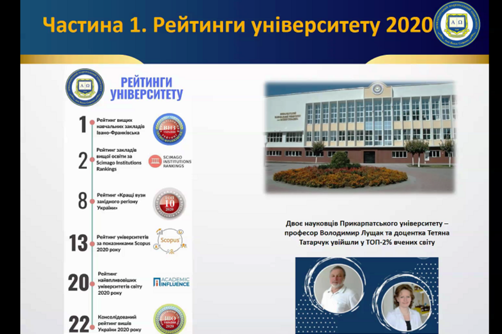 Прикарпатський національний університет імені Василя Стефаника кожного року покращує власні позиції у впливових вітчизняних та міжнародних рейтингах закладів вищої освіти. Цю позитивну тенденцію відзначила проректорка з наукової роботи, професорка Валентина Якубів під час онлайн-засідання вченої ради за участю професорсько-викладацького складу. Читати далі