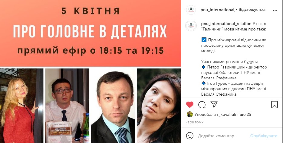 Сьогодні, 05 квітня 2021 року, викладачі кафедри міжнародних відносин доц. Гурак І. Ф. та директор Наукової бібліотеки Прикарпатського національного університету імені Василя Стфеника Гаврилишин П. М. поділилися з глядачами телеканалу “Галичина” особливостями підготовки студентів на спеціальності 291 Міжнародні відносини, суспільні Читати далі