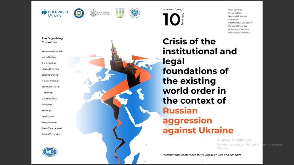 10 грудня на базі Факультету історії, політології і міжнародних відносин відбулася міжнародна конференція для молодих науковців на тему: «Crisis of the institutional and legal foundations of the existing world order in the context of Russian aggression against Ukraine». Організаторами заходу з боку Прикарпатського національного університету імені Василя Стефаника виступили працівники кафедр міжнародних відносин, іноземних мов та перекладу, учасники студентського наукового гуртка «Дипломат». Співорганізаторами англомовного онлайн-форуму виступили офіс Програми імені Фулбрайта в Україні, Варшавський, Вроцлавський та Карабюкський університети.