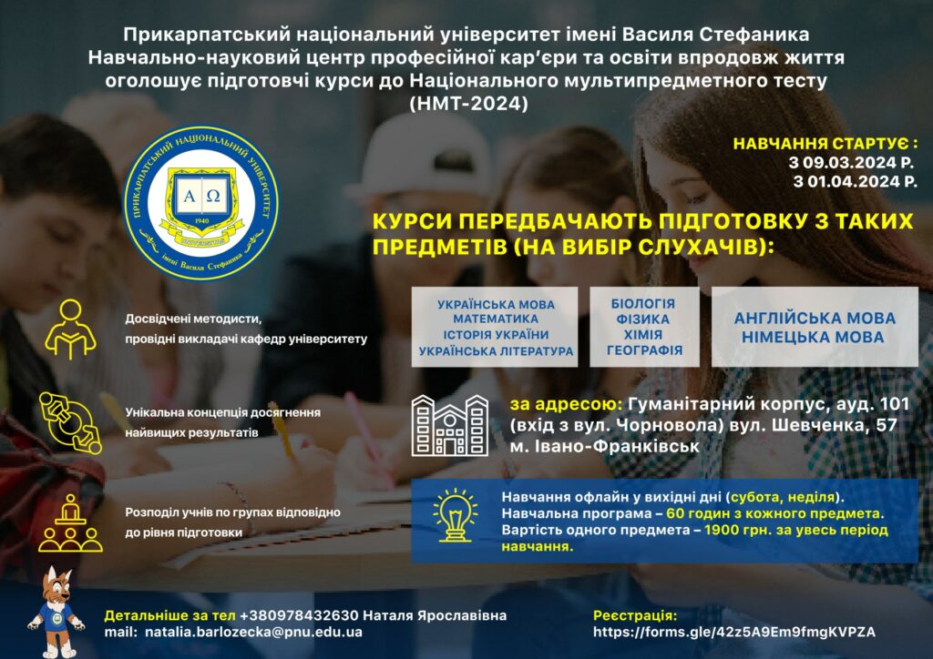 Прикарпатський національний університет імені Василя Стефаника Навчально-науковий центр професійної кар’єри та освіти впродовж життя оголошує підготовчі курси до Національного мультипредметного тесту (НМТ-2024). Курси передбачають підготовку з таких предметів (на вибір слухачів): – українська мова – математика – історія України – Читати далі