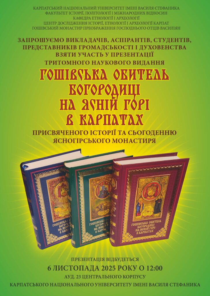 6 листопада 2025 р. о 12:00 в 23 аудиторії Центрального корпусу Карпатського національного університету імені Василя Стефаника відбудеться презентація тритомного наукового видання «Гошівська обитель Богородиці на Ясній Горі в Карпатах» присвяченого історії й сьогоденню Ясногірського монастиря та 35-річчю виходу Української греко-католицької церкви Читати далі